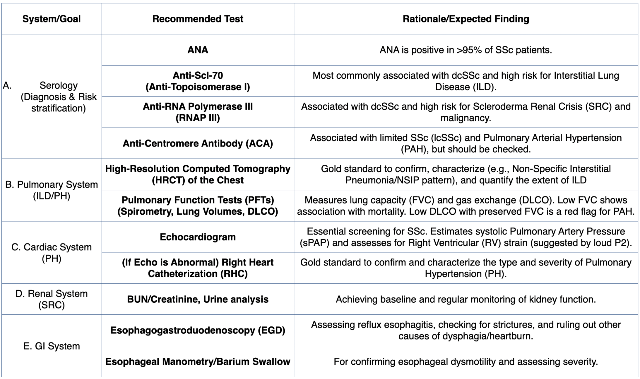 2. Next step investigations: The investigation strategy is aimed at confirming SSc and, critically, assessing the extent and severity of internal organ disease (especially lung and heart).