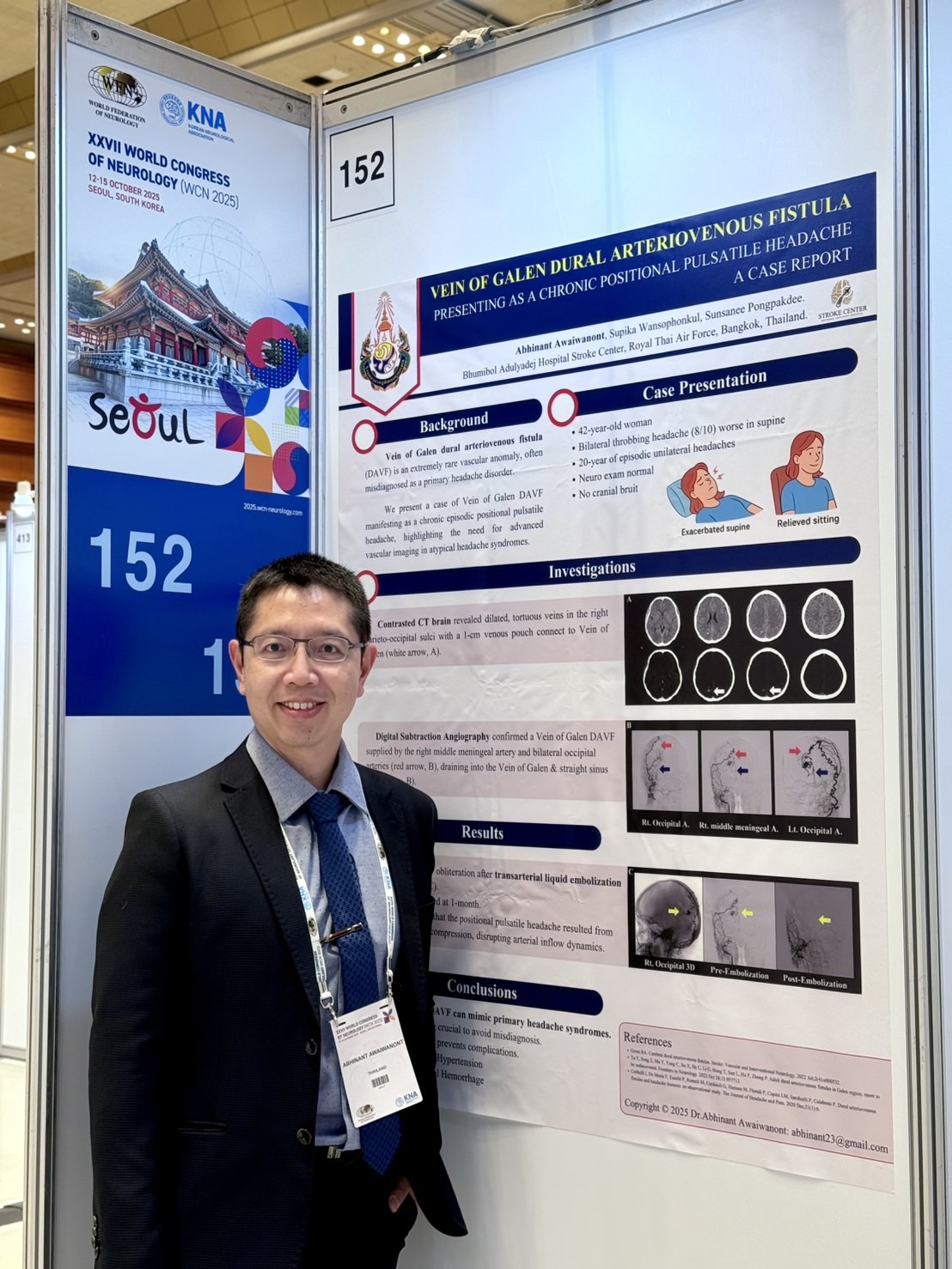 น.ท.อภินันท์ อวัยวานนท์ อาจารย์หน่วยอายุรศาสตร์ประสาทวิทยา กองอายุรกรรม รพ.ภูมิพลอดุลยเดช กรมแพทย์ทหารอากาศ ได้ค้นคว้าและจัดทำ Poster presentation และนำเสนอที่งาน XXVII World Congress of Neurology WCN ประจำปี 2025 ณ กรุงโซล ประเทศเกาหลีใต้ ซึ่งจัดขึ้นในวันที่ 12-15 ตุลาคม พ.ศ.2568